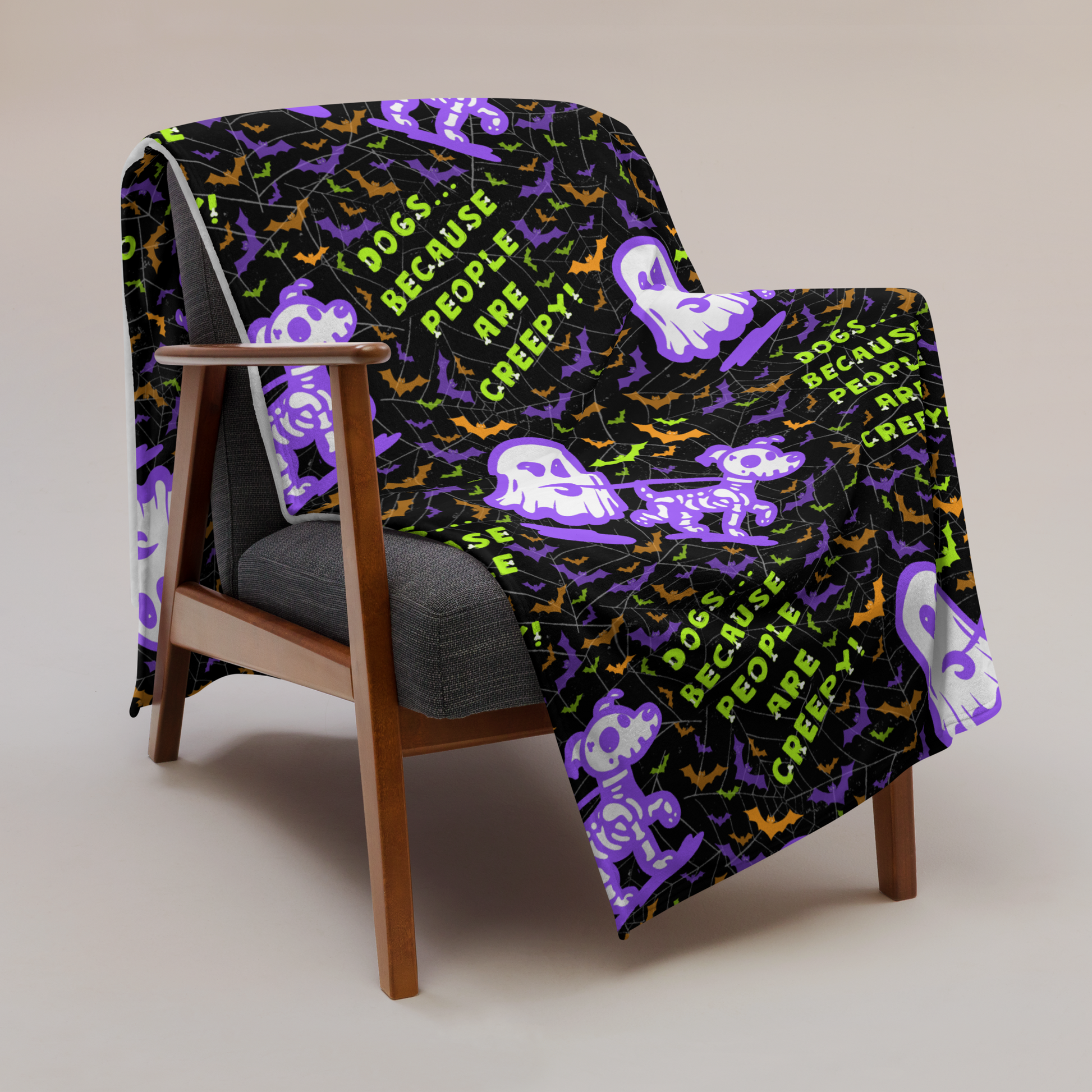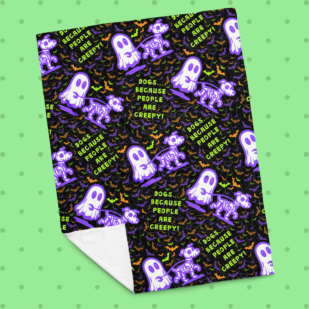 Back by popular demand with a fresh new look! Our “Dogs... Because People Are Creepy” design is perfect for spooky season and year-round sass. Featuring a ghostly dog walker, skeleton pittie (with signature ears, of course), and bone-detailed lettering... this one’s for our introverted dog lovers who know where the real loyalty lies. Our throws are lightweight yet warm, hypoallergenic, and silky-soft to the touch. Design is printed in vibrant color on one side with a clean white reverse.