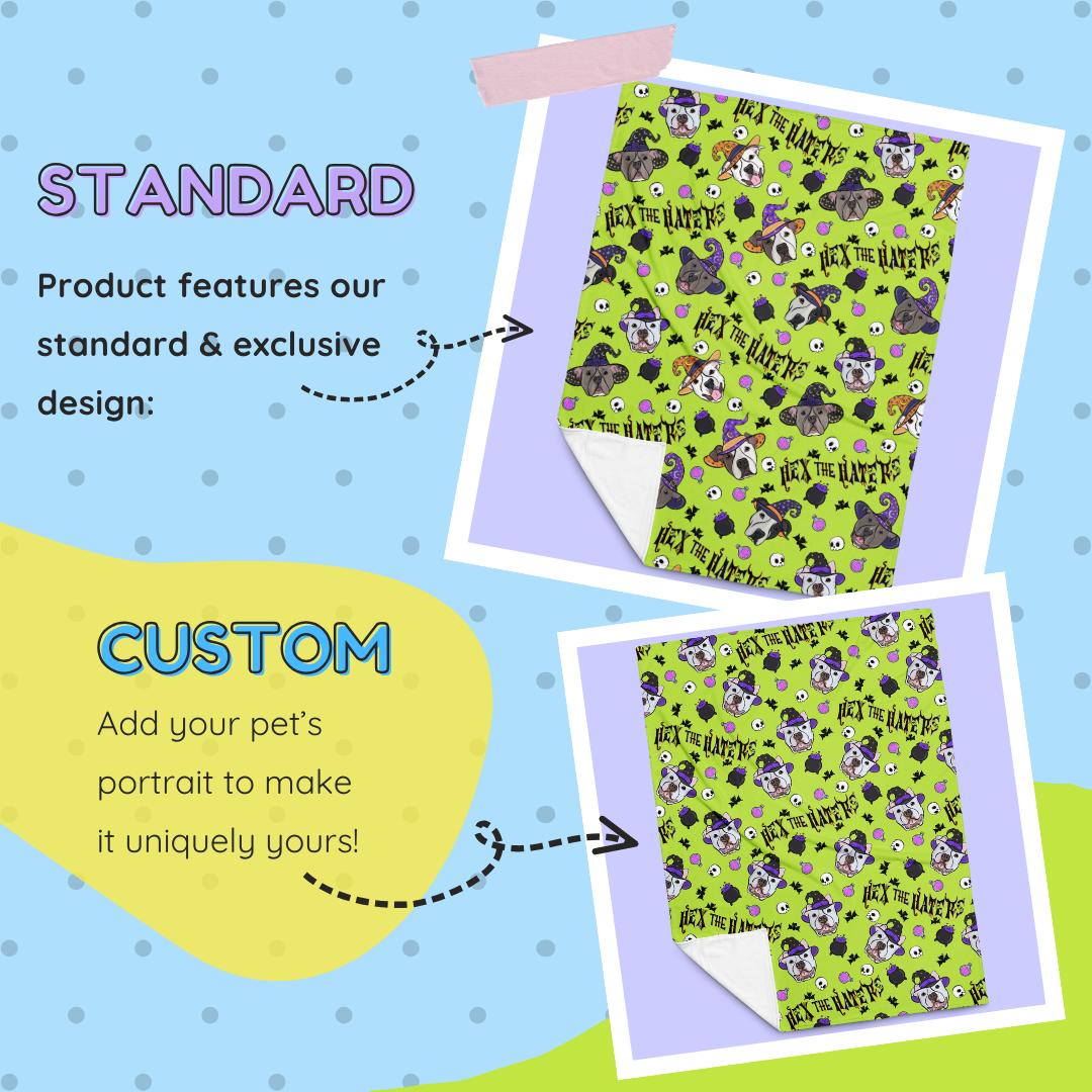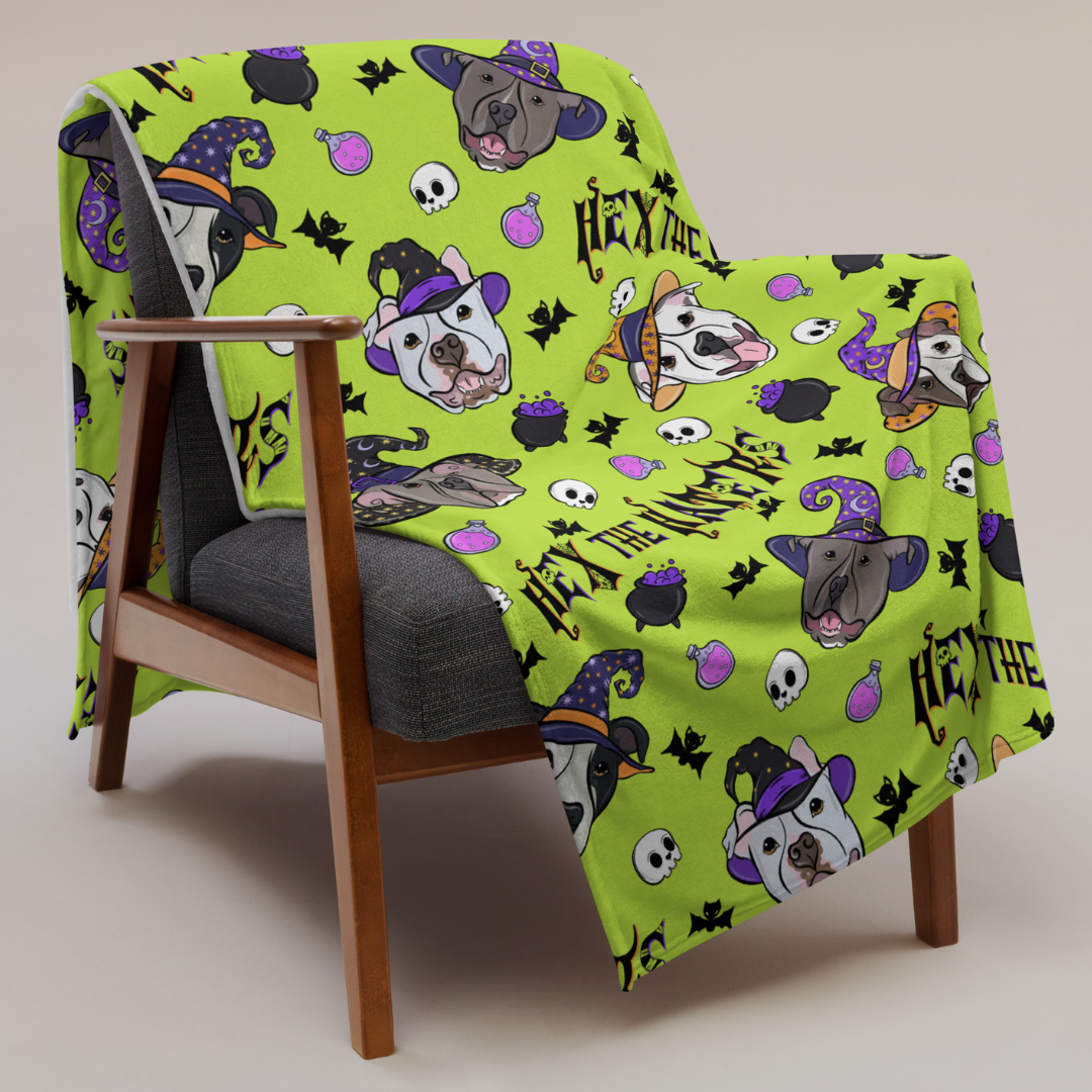 Wrap yourself in spooky season sass. This exclusive design features some of your fave IG pittie pals - Lexi, Bolt, Murphy, Ryn, Chaplin, & Cielo - throwing the cutest shade to all the haters! Our throw blankets are lightweight yet warm, hypoallergenic, & silky to the touch. The design is printed in vibrant color on one side, with a crisp white background on the other.