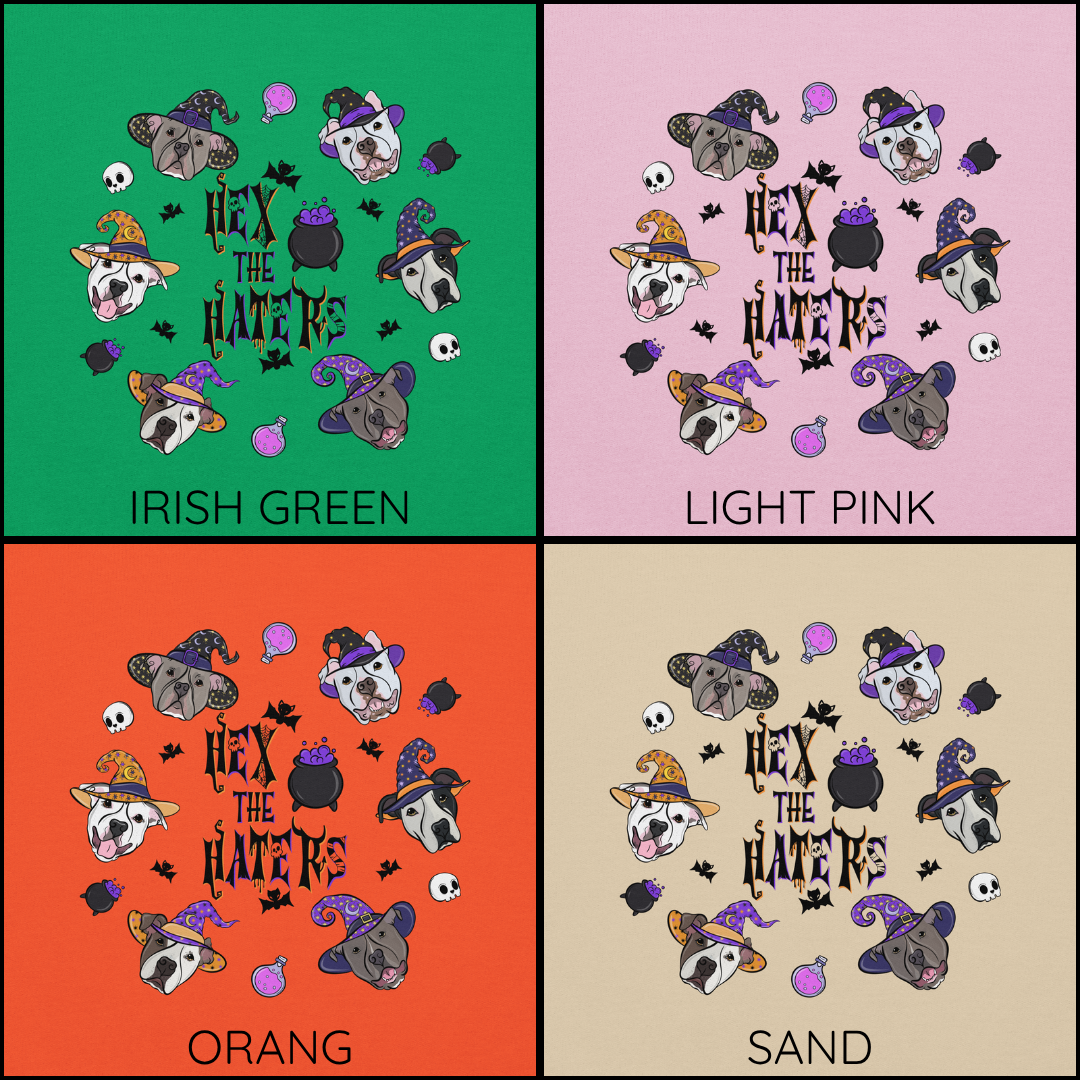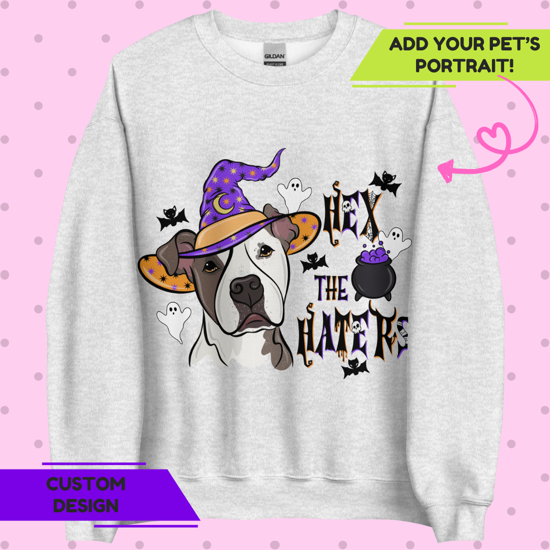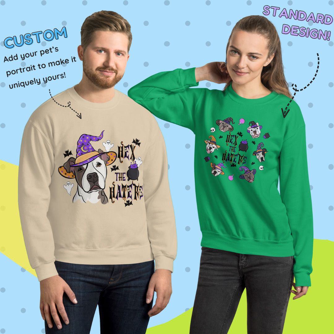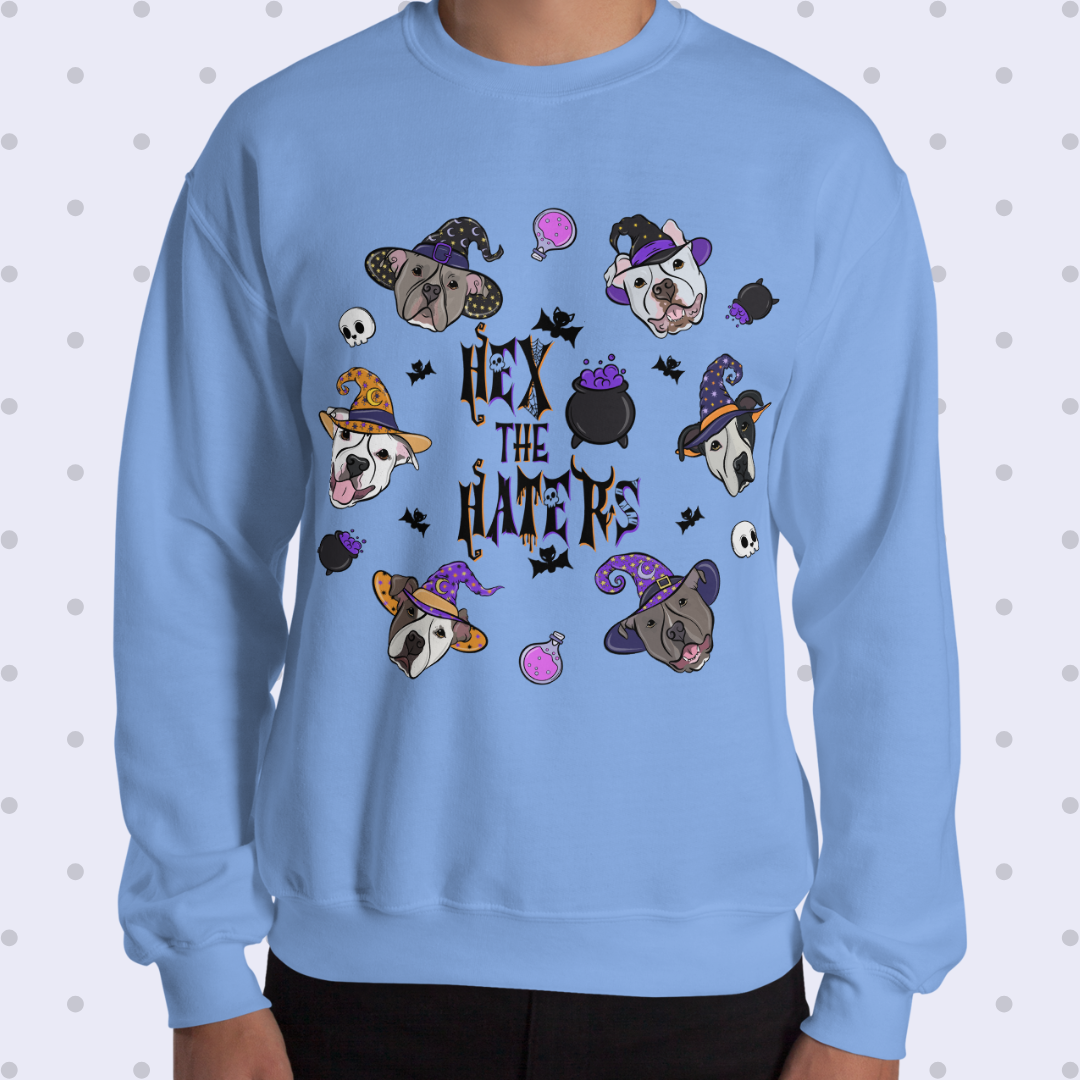 Prepare for this spooky season with our exclusive Hex the Haters Unisex Sweatshirt! Featuring some of your favorite IG faces, - Lexi, Bolt, Murphy, Ryn, Chaplin, & Cielo - there's no cuter way to throw shade to all the haters this Halloween & Pittie Awareness Month season!