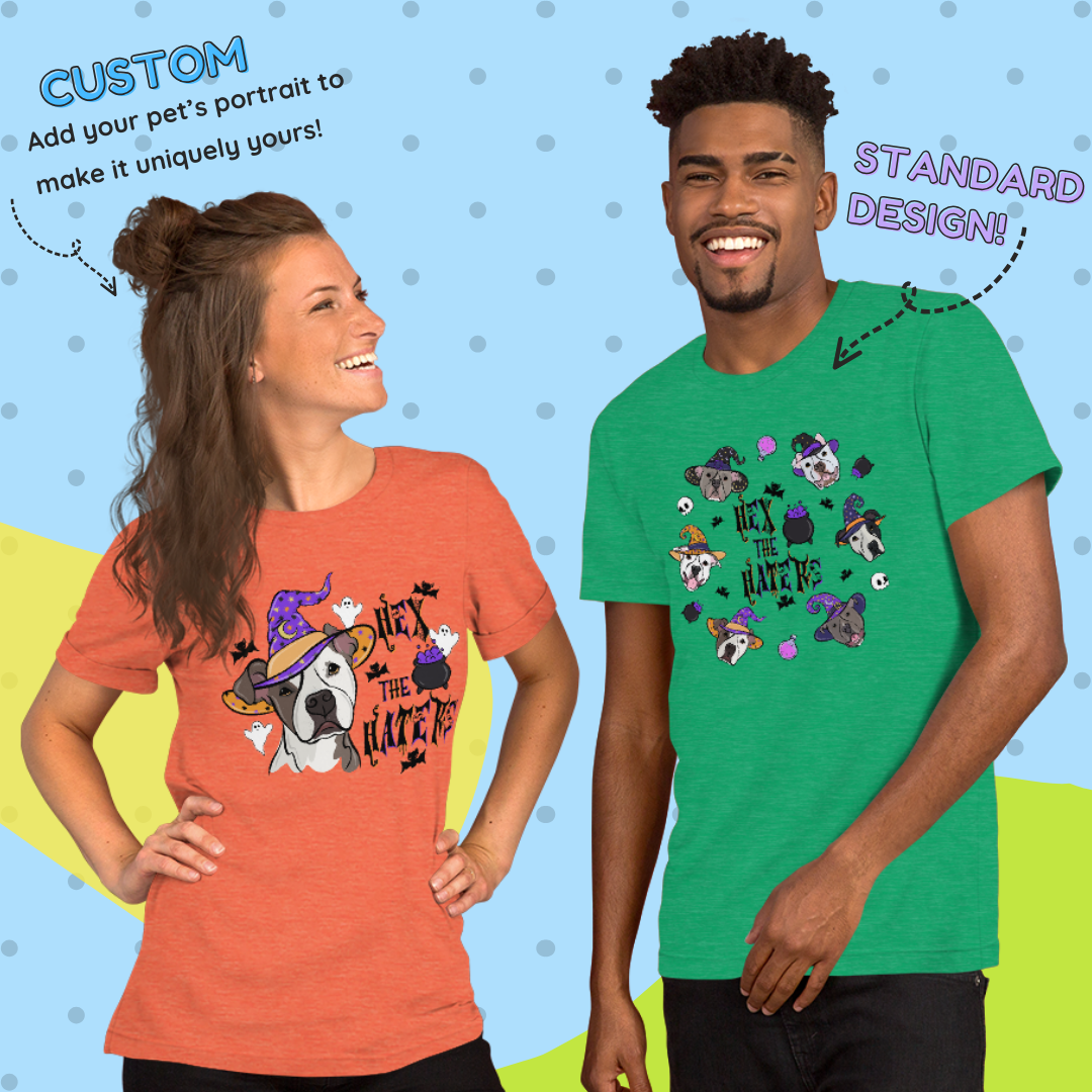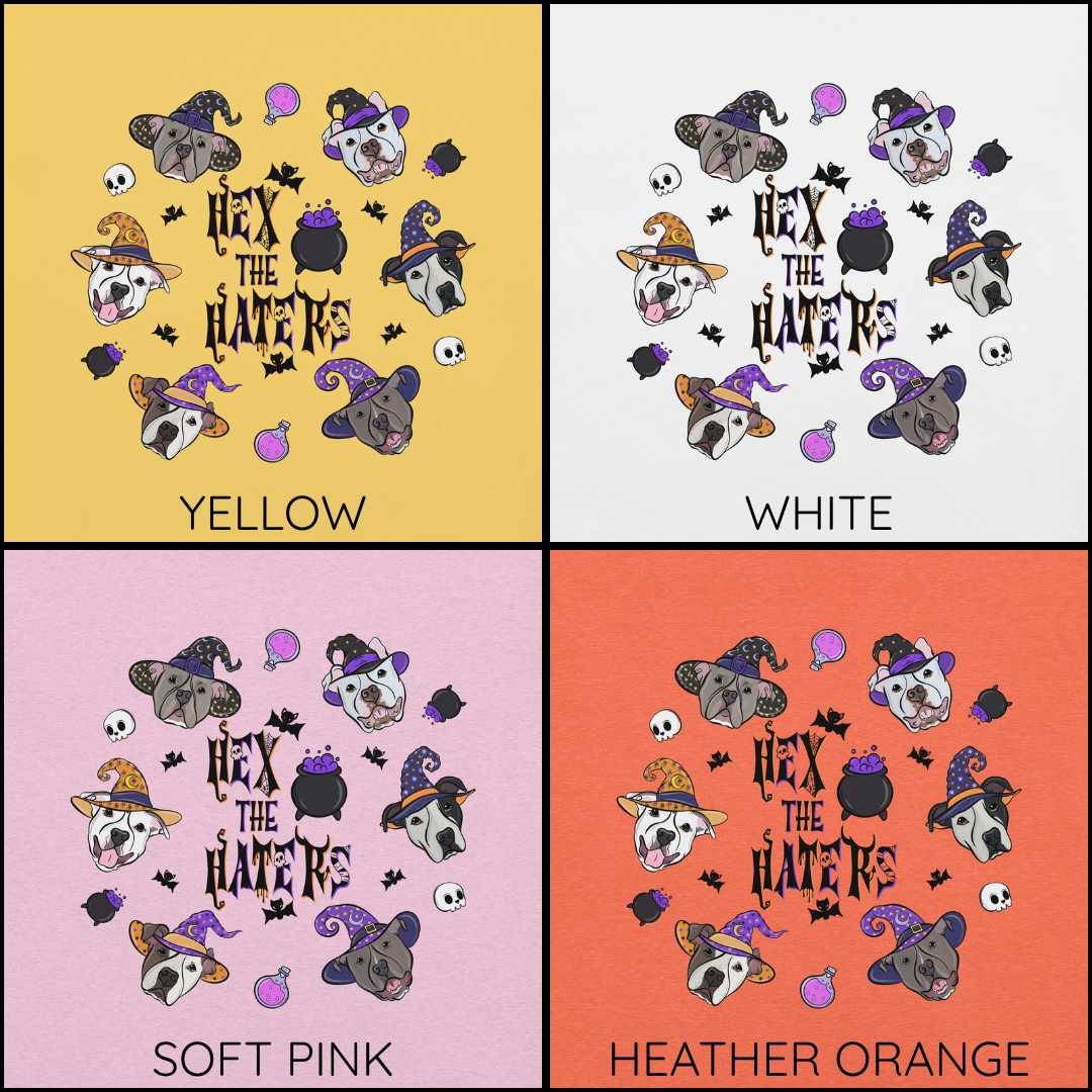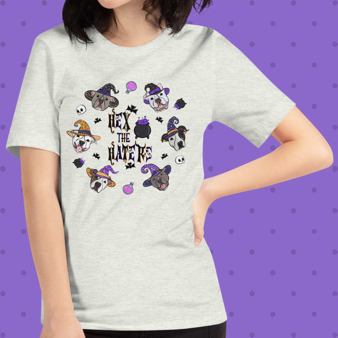 Prepare for this spooky season with our exclusive Hex the Haters Unisex Tee! Featuring some of your favorite IG faces, - Lexi, Bolt, Murphy, Ryn, Chaplin, & Cielo - there's no cuter way to throw shade to all the haters this Halloween & Pittie Awareness Month season!