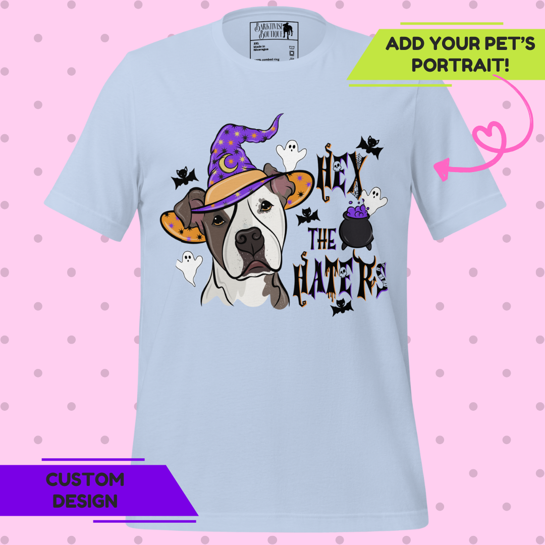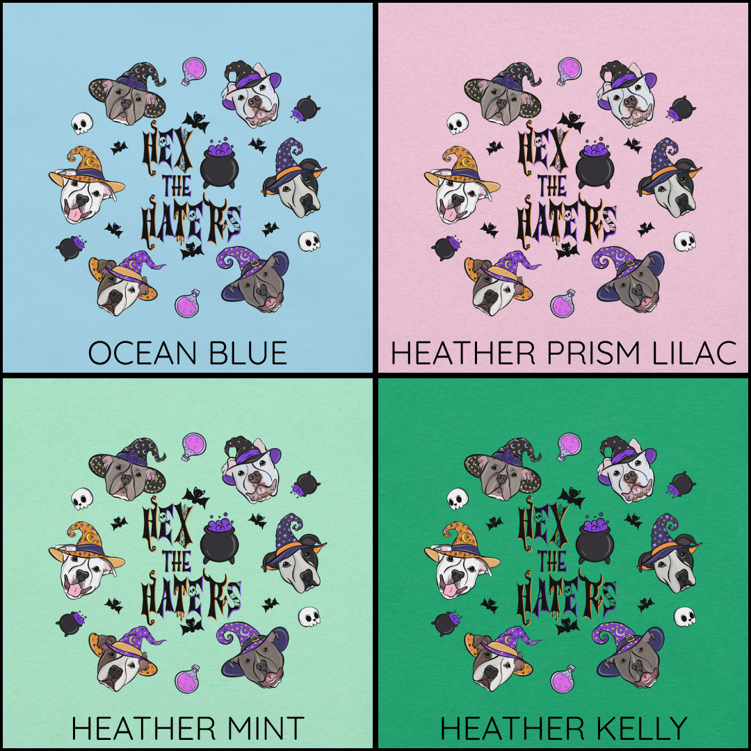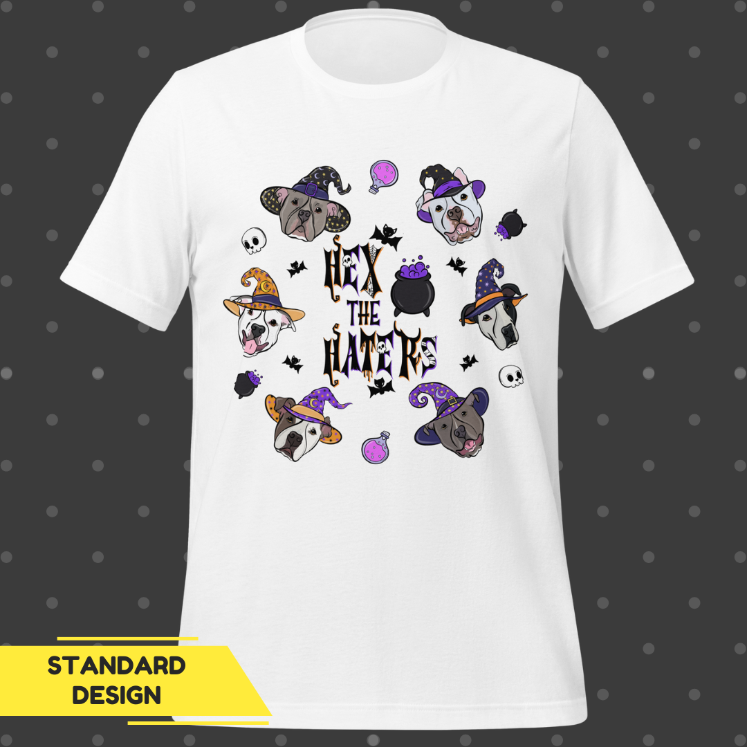 Prepare for this spooky season with our exclusive Hex the Haters Unisex Tee! Featuring some of your favorite IG faces, - Lexi, Bolt, Murphy, Ryn, Chaplin, & Cielo - there's no cuter way to throw shade to all the haters this Halloween & Pittie Awareness Month season!