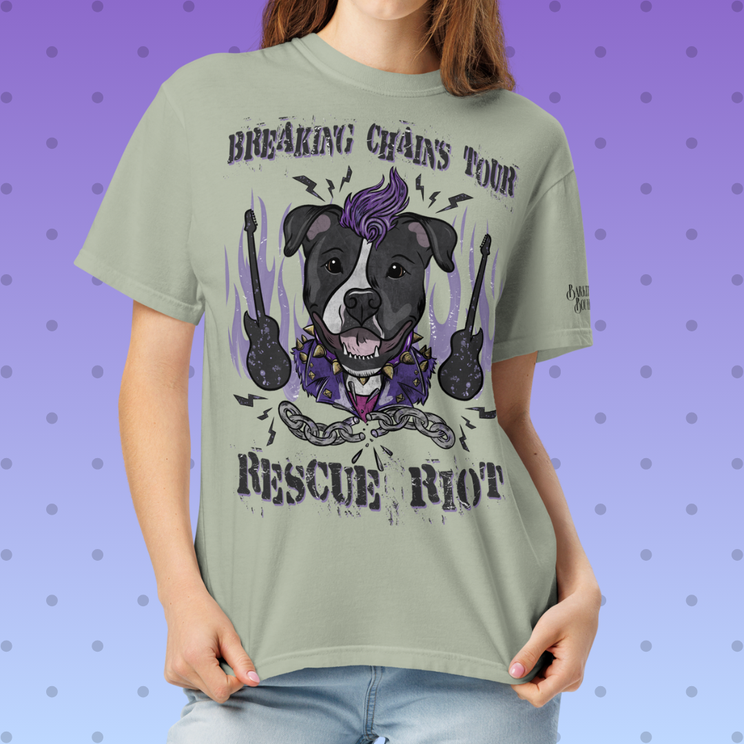 Rescue Riot is on tour with a headbanin' new t-shirt that shouts love for pitties & rescue dogs everywhere! Our Exclusive Breaking Chains Tour design features a faux-band front & a back setlist of advocacy anthems like "Break the Chains" & "Systemic Barkdown!"