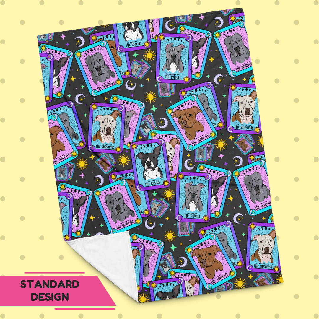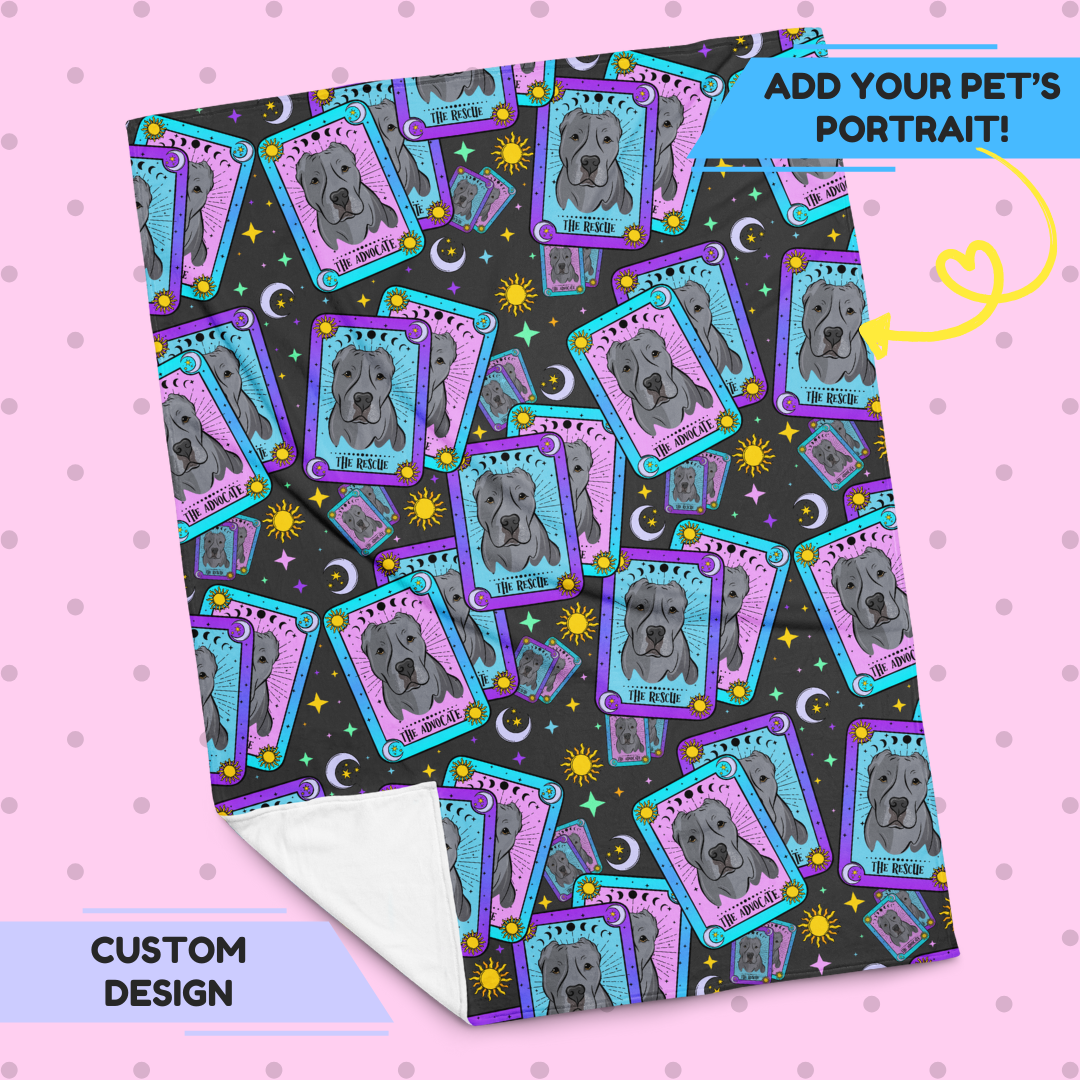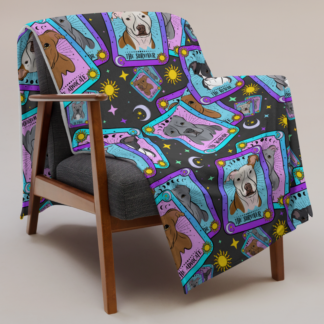 Wrap yourself in soulful mystique with our EXCLUSIVE Misjudged Oracle pattern featuring some of your favorite IG faces - Frankie, Oakley, Fiona, Oliver & Edward. With a retro palette & cosmic flair, this throw is the perfect blend of bold advocacy, heartfelt magic, & misunderstood charm. Our throws are lightweight yet warm, hypoallergenic, & silky to the touch. The design is printed in vibrant color on one side, with a crisp white background on the other.