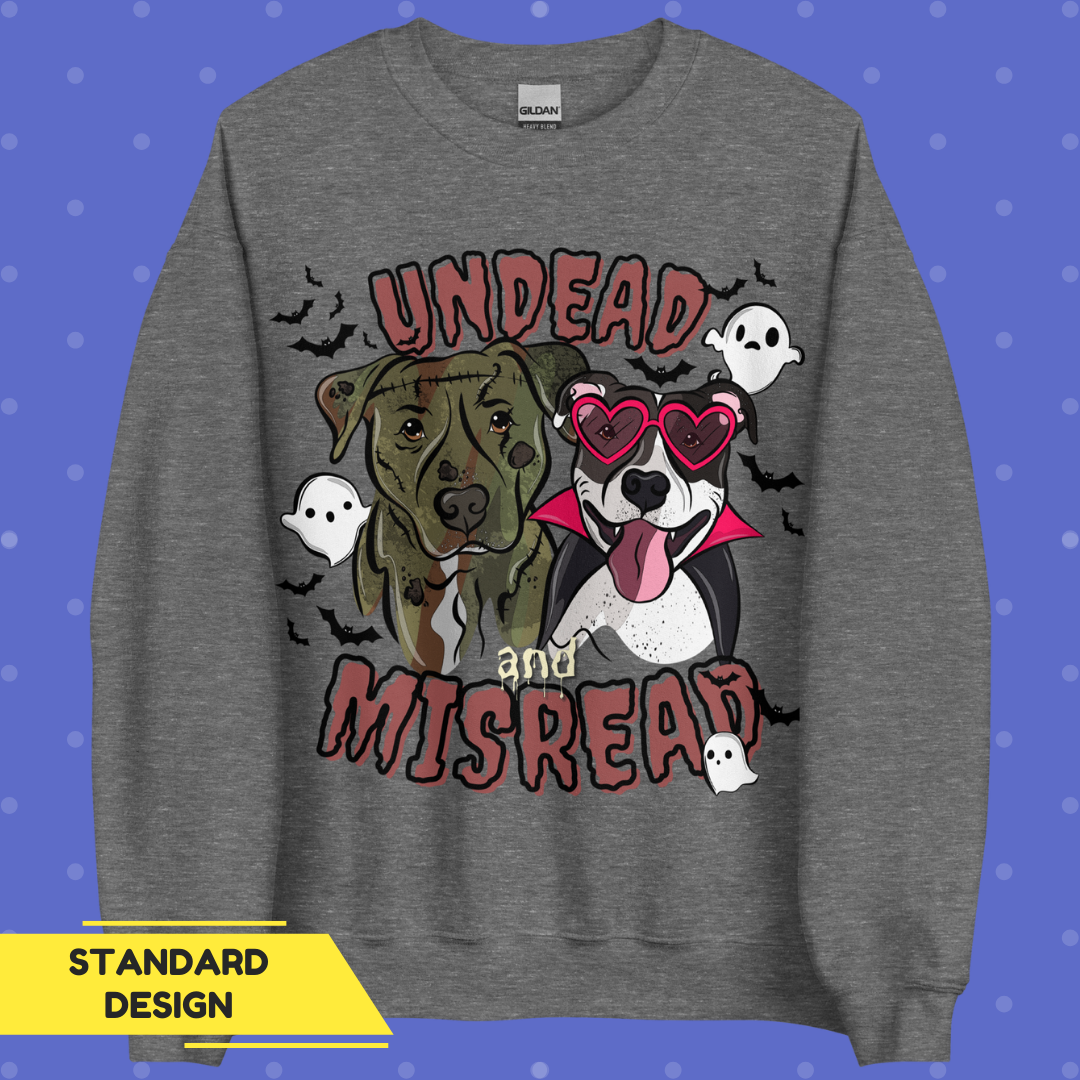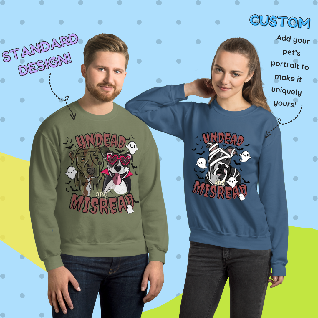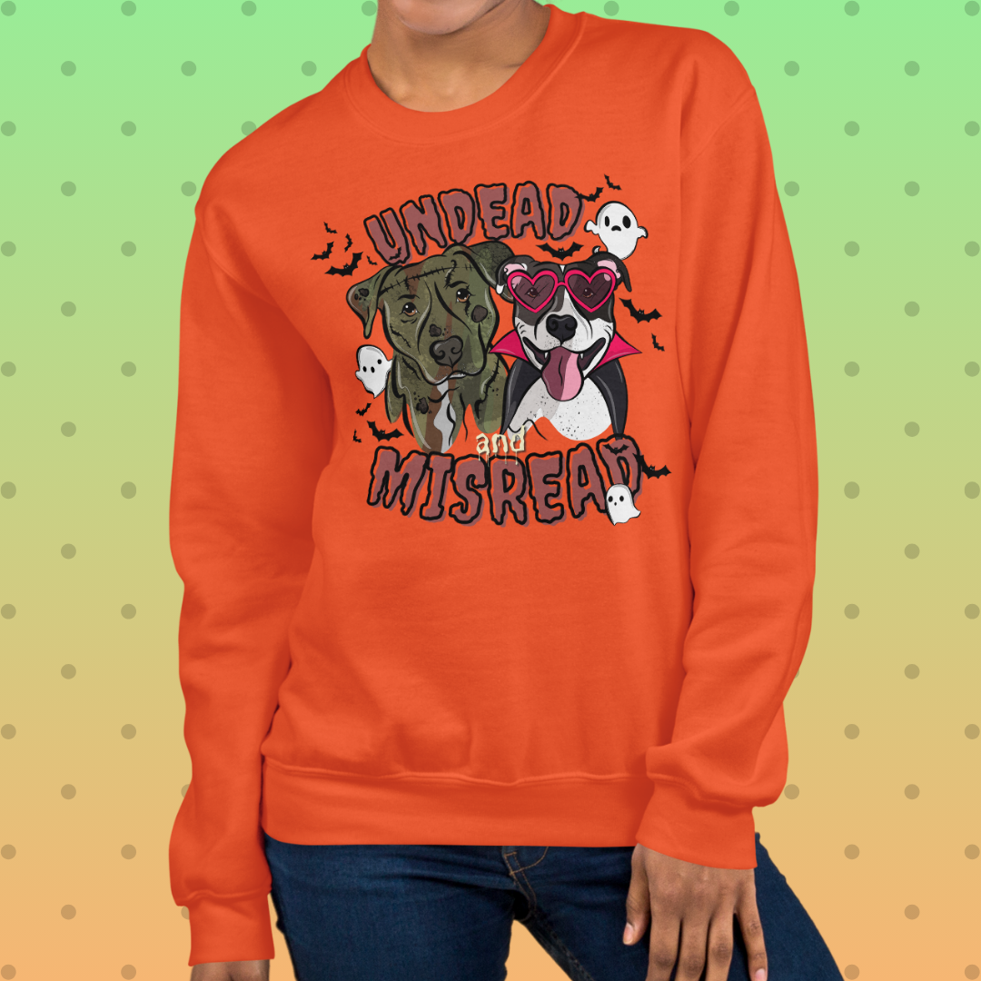Celebrate spooky season & Pittie Awareness Month with our "Undead & Misread" sweatshirt - starring your favorite IG cuties, Zombie Toby & Dracula Tilly! With a vintage horror flick vibe & a wink at how often pitties are misunderstood, this design is equal parts playful & powerful! Customize it to feature your own pup(s) & help reanimate the truth: they're not monsters - just misread!